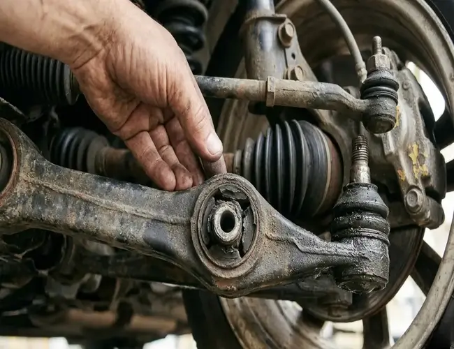 Over time, rubber bushings crack or deteriorate. When this happens, the control arm can shift slightly under load, producing a dull clunk over bumps.